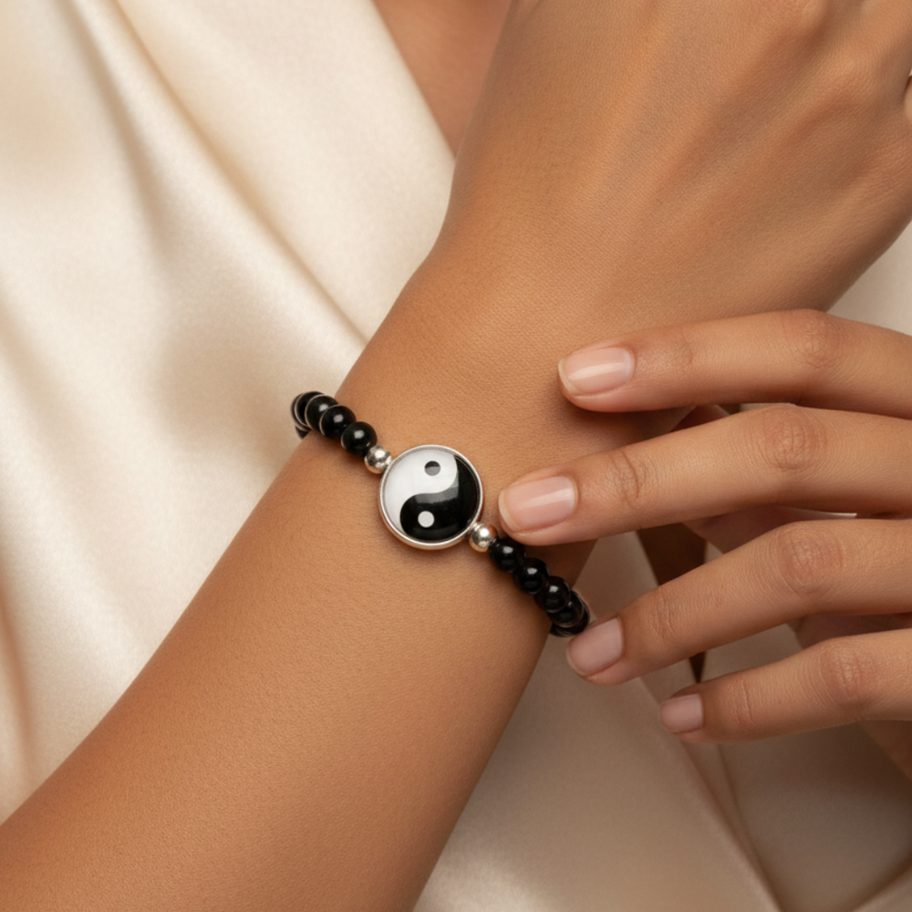This elegant stretch bracelet features a striking Yin Yang centerpiece, symbolizing balance and harmony in a classic monochrome design. The charm is securely set in a polished silver-tone frame, flanked by two matching metallic accent beads that provide a sophisticated touch. Strung on a flexible cord for a comfortable, one-size-fits-all feel, the bracelet is composed of high-shine, jet-black spherical beads that offer a sleek and modern aesthetic. Perfect for daily wear or as a meaningful gift, this piece seamlessly blends spiritual symbolism with contemporary style.