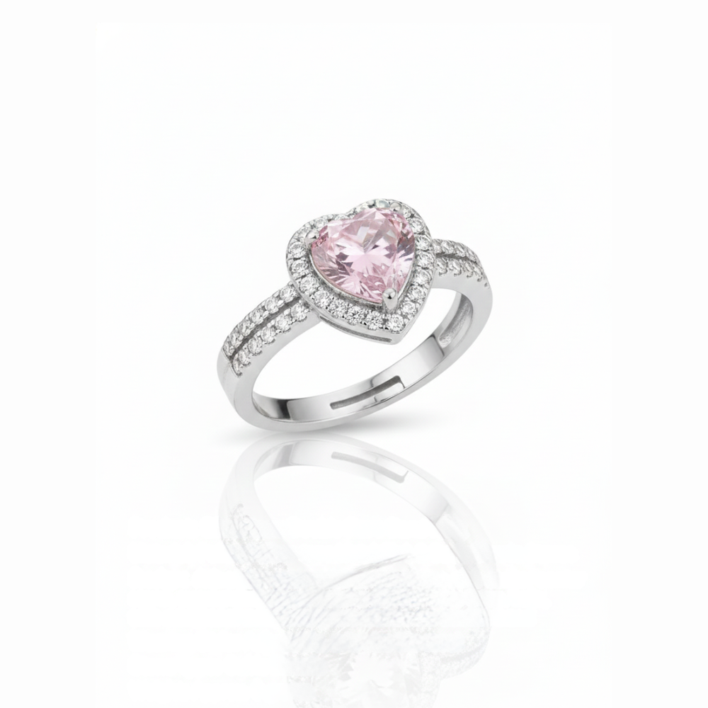 This elegant piece is a romantic heart-shaped statement ring featuring a brilliant pink heart-cut center stone. The focal point is beautifully encircled by a shimmering halo of micro-pave crystals, extending down a double-row pave-set band to capture light from every angle. Expertly crafted from a durable blend of brass and copper, the ring is finished with a high-shine platinum plating for a sleek, tarnish-resistant, silver-toned aesthetic. Whether intended as a promise ring or a sophisticated accessory for special occasions, this design offers a timeless blend of luxury and charm.